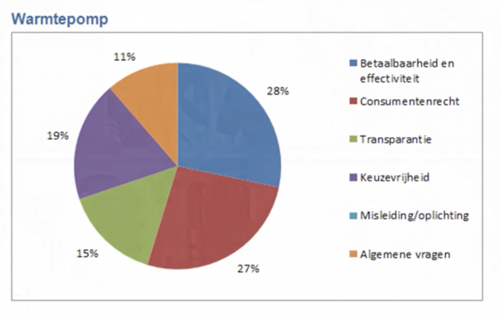Vera: Dit is gebaseerd op het klantcontactsysteem. Je ziet dat de taartpunten ‘keuzevrijheid’, ‘consumentenrecht’, ‘betaalbaarheid’ en ‘effectiviteit’ de grootste onderwerpen waren bij het onderwerp ‘warmtepomp’. En betaalbaarheid betekent dan: levert mijn warmtepomp het gewilde rendement op als ik hem heb gekocht? Daar zijn veel klachten over, dat mensen hun huis niet warm krijgen. Die meldingen zagen we dan in het klantcontact-registratiesysteem terugkomen. En ook over consumentenrecht: ik heb problemen met de installatie van mijn warmtepomp, wat moet ik doen? Die signalen gingen we uitharken en vervolgens naast de gesprekken van de stakeholders leggen en naast het Google-onderzoek en de resultaten uit de KTO.